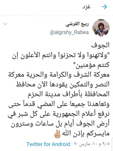 وأضاف القرشي في تغريدة نشرها على حسابها في تويتر ورصدها مراسل “عدن نيوز” “ولاتهنوا ولا تحزنوا وانتم الأعلون إن كنتم مؤمنين”.. معركة الشرف والكرامة والحرية معركة النصر والتمكين يقودها الآن محافظ المحافظة بأطراف مدينة الحزم وتعاهدنا جميعا على المضي قدمآ حتى نرفع أعلام الجمهورية على كل شبر في أرض الجوف أيام بل ساعات وسترون مايسركم بإذن الله”.