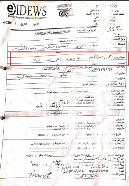 الوثيقتان الاخريتان رسميتان ايضا صادرتان عن وزارة الصحة التابعة لمليشيا الانقلاب الحوثية، وهما عبارة عن نموذجي استقصاء لحالة كورونا لشخصين: الاول يدعى احمد حسين الجنيد، والآخر يدعى علي يحيى العماد .. وكلاهما من ابناء السلالة الهاشمية، الامر الذي يؤكد روايته بأن الوباء انتقل الى اليمن عبر هؤلاء الاشخاص الذين عادوا الى صنعاء مؤخرا قادمين من طهران.