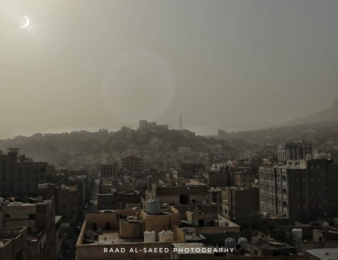 وأظهرت صورة محافظة تعز تغرق في الظلام صباح اليوم جراء كسوف الشمس.