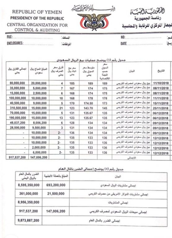 ولم تظهر في حساب خزينة البنك المركزي للريال السعودي دخل البنك المركزي في عدن وبالتالي زيادة الفارق في عمليات مصارفة المبلغ اعلاه، بالإضافة إلى ذلك لم يتم مراجعة الجهاز لعملية شراء البنك المركزي اليمني مبلغ 47 مليون ريال سعودي من البنك الأهلى اليمنى بتاريخ 21 فبراير 2019م والتي بلغ الفارق فيها مبلغ 376.5 مليون ريال.