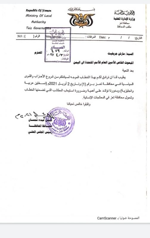 وأعربت السلطة المحلية والأحزاب في رسالة وجهوها للمبعوث الأممي وصل “عدن نيوز” نسخة منها عن أسفها للمعاملة غير العادلة وحالة التجاهل لقضية تعز في الإحاطات والمبادرات التي يتبناها المجتمع الدولي خاصة في الجوانب الانسانية والانتهاكات.