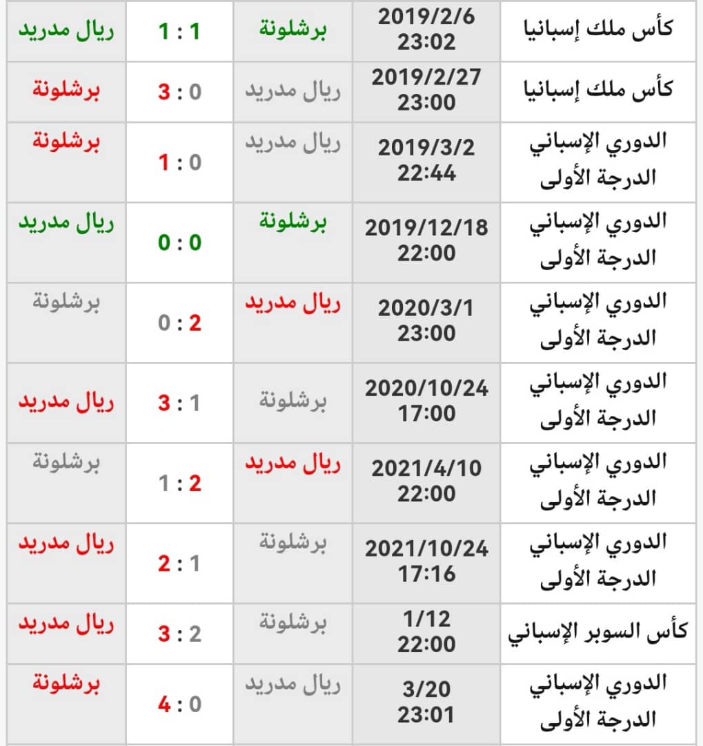ومنذ مطلع العام 2019 أقيمت 10 مواجهات كلاسيكو رسمية، فاز ريال مدريد في 4 مرات، كما فاز برشلونة بنفس العدد من المرات، وكان التعادل مرتين.