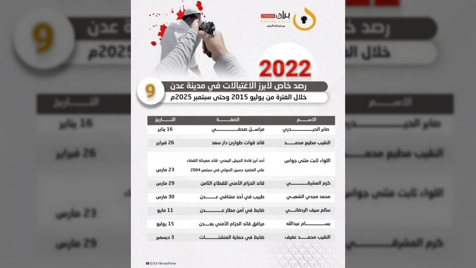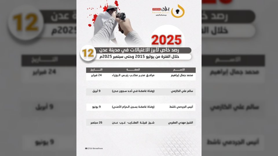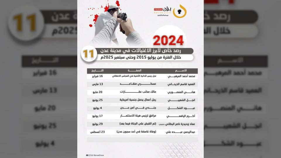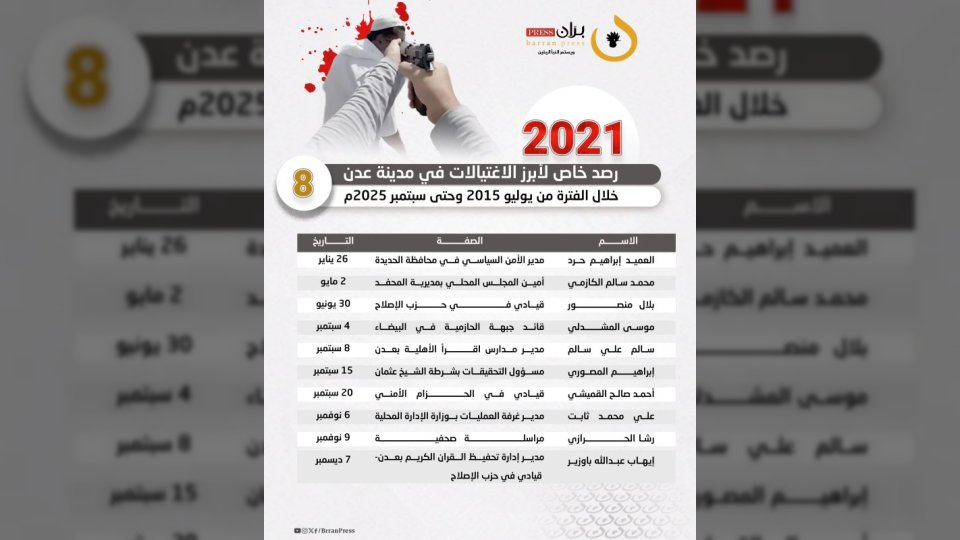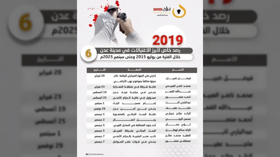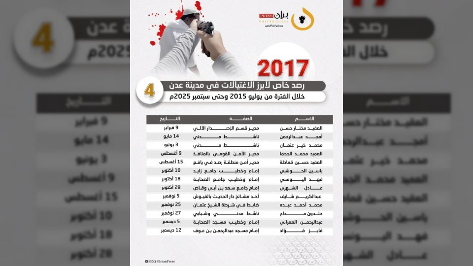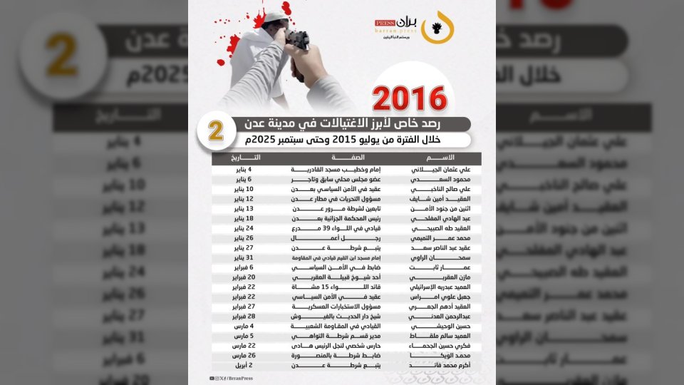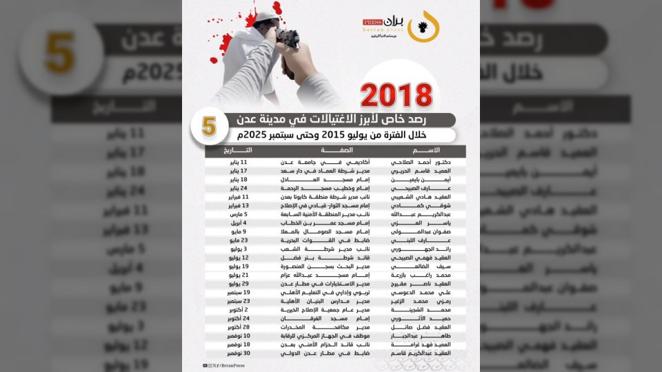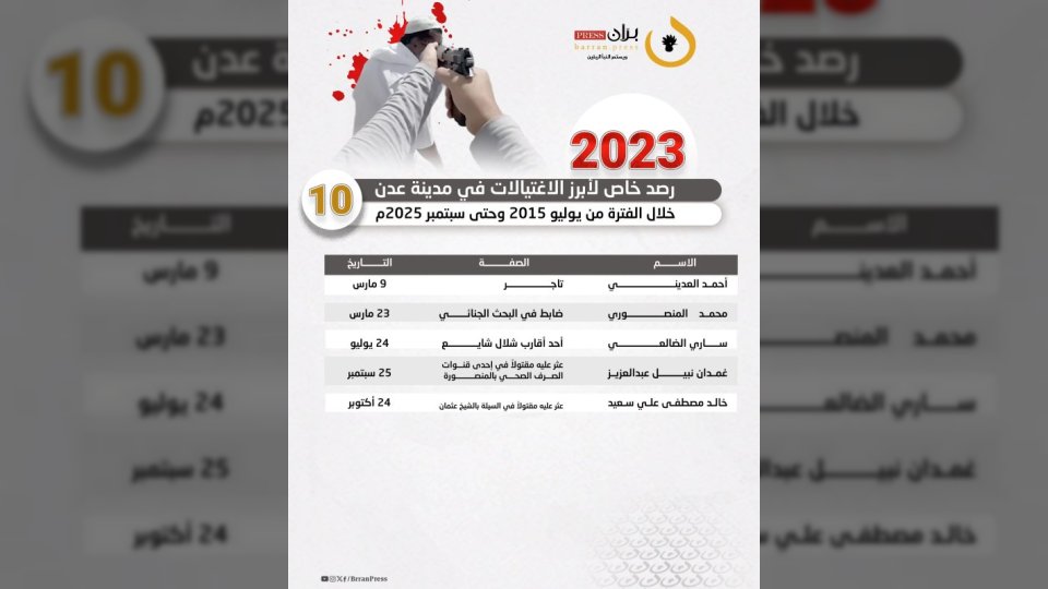في ظل أجواء من التوتر والقلق، تواصل مدينة عدن تسجيل حلقات متتالية من الاغتيالات التي تستهدف شخصيات بارزة، حيث رصدت شبكة “برّان برس” 156 عملية قتل طالت علماءً ودعاةً وقيادات عسكرية وأمنية وجنودًا وناشطين، خلال الفترة بين أغسطس 2015 وسبتمبر 2025.