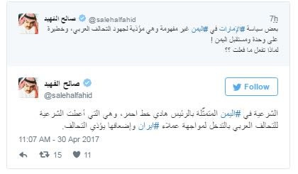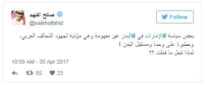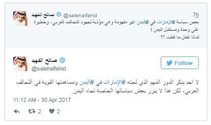 واختتم الكاتب السعودي تغريداته بـ: “لا أحد ينكر الدور المهم الذي لعبته الإمارات في اليمن، ومساهمتها القوية في التحالف العربي، لكن هذا لا يبرر بعض سياساتها الخاصة تجاه اليمن“.