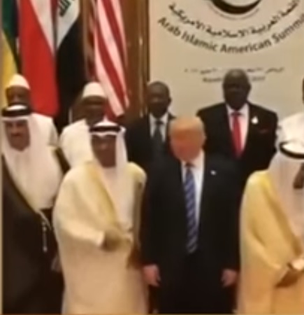 أما قبل مغادرة ترمب للرياض، وعند التقاط صورة جماعية مع الزعماء الحاضرين، وبينما كان تميم يقف جواره، خالف ابن زايد البروتوكول وتدخل وأزاح تميم بكتفه للخلف ووقف بجانب ترمب.