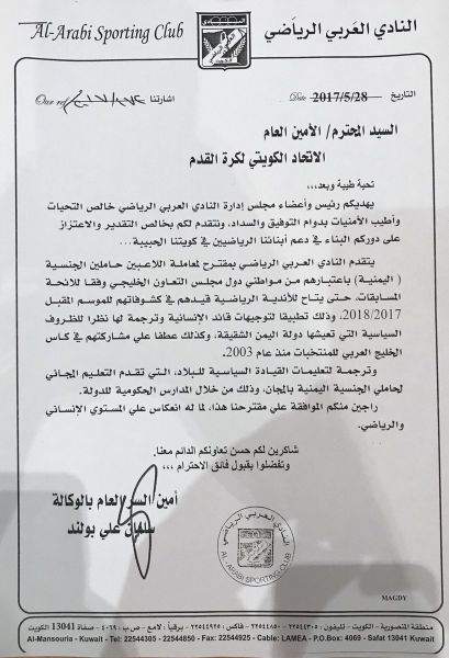 تقدم النادي العربي الكويتي، بمقترح لاتحاد الكرة المحلي في بلاده، يدعوه فيه إلى اعتبار اللاعب اليمني “مواطناً خليجياً” اعتباراً من الموسم القادم 2017/ 2018.