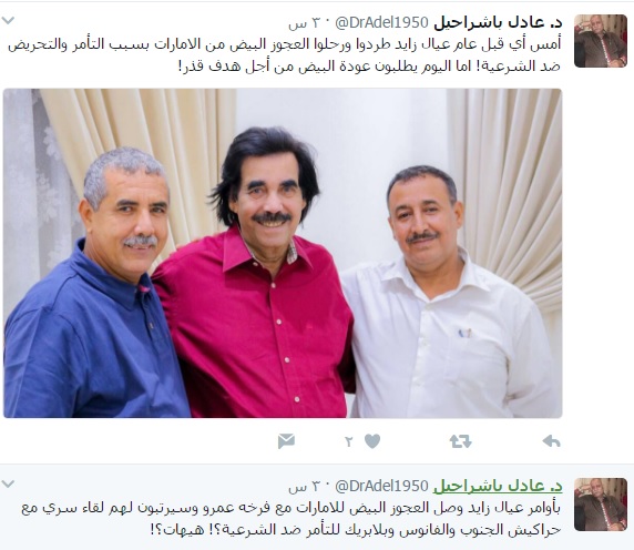 وأضاف باشراحيل في تغريدة أخرى “بأوامر عيال زايد وصل العجوز البيض للامارات مع فرخه عمرو وسيرتبون لهم لقاء سري مع حراكيش الجنوب والفانوس وبلابريك للتآمر ضد الشرعية؟! هيهات؟!”.