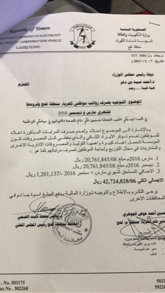 وذكر المصدر أن حكومة الدكتور بن دغر تحتفظ بوثائق رسمية تؤكد توجيهات رئيس الوزراء في شهر فبراير الماضي بصرف مبالغ مالية مستحقات لكهرباء محافظة لحج إضافة لوثيقة أخرى تحمل توجيه رئيس الوزراء بصرف رواتب موظفي مؤسسة الكهرباء في المخافظة.