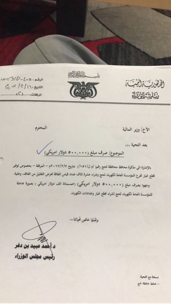 الوثائق التي اطلعت عليها يمن تليجراف وعددها ثلاث وثائق ، حملت اﻷولى توجيه رئيس الوزراء بصرف مبلغ مبلغ ثلاثمائة وثانية وستون ريال. وحملت الثانية التوجيه بصرف مبلغ خمسة ملايين دولار امريكي، وهي مستحقات لكهرباء المحافظة.