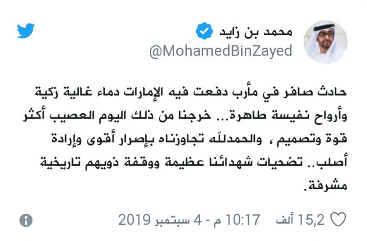 وزعم بن زايد -في تغريدة بحسابه على توتير- أن حادث صافر في مأرب دفعت فيه الإمارات دماء غالية زكية وأرواح نفيسة طاهرة.