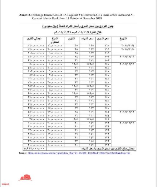 رسالة فريق لجنة العقوبات تضمنت مجموعة من الوثائق التي تخضع للتحقيق من قبل الفريق نتيجة عمليات فساد كبيرة أهمها عمليات التلاعب والمضاربة بالعملة الوطنية من قبل البنك المركزي حيث بينت إحدى الوثائق وجود فوارق بين أسعار السوق وأسعار الشراء تجاوزت مبلغ الثمانية مليار ريال يمني.